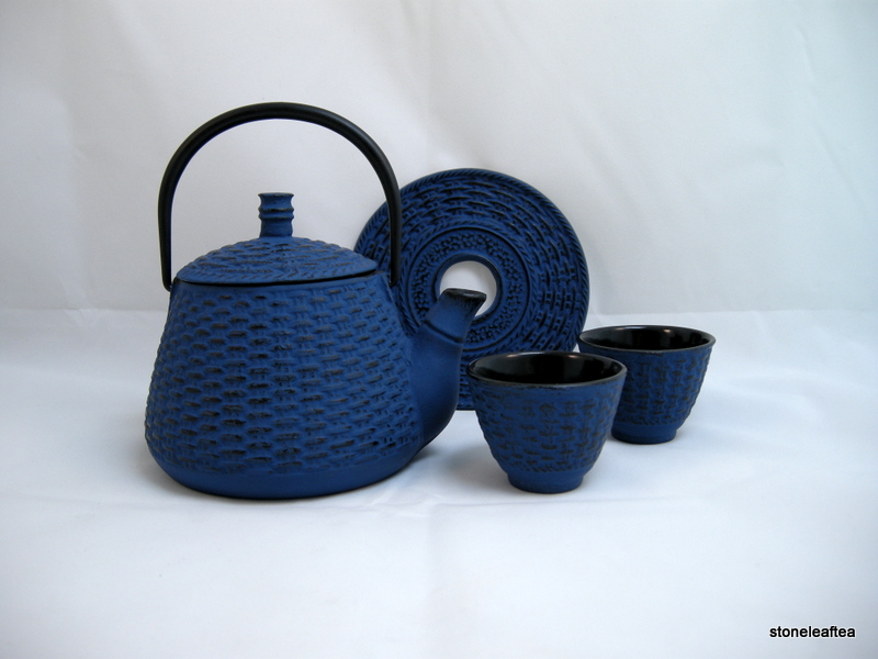 A beautiful set, consisting of a cast iron teapot, two cups, strainer and trivet. All you need! This functional cast iron, Japanese tetsubin style teapot is lined with an enamel to prevent rusting, and provide a solid heat retention for brewing many styles of tea. (Not recommended for stovetops!)