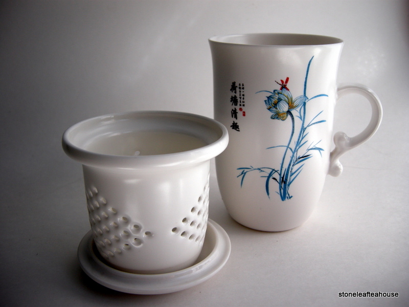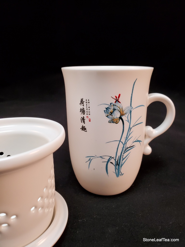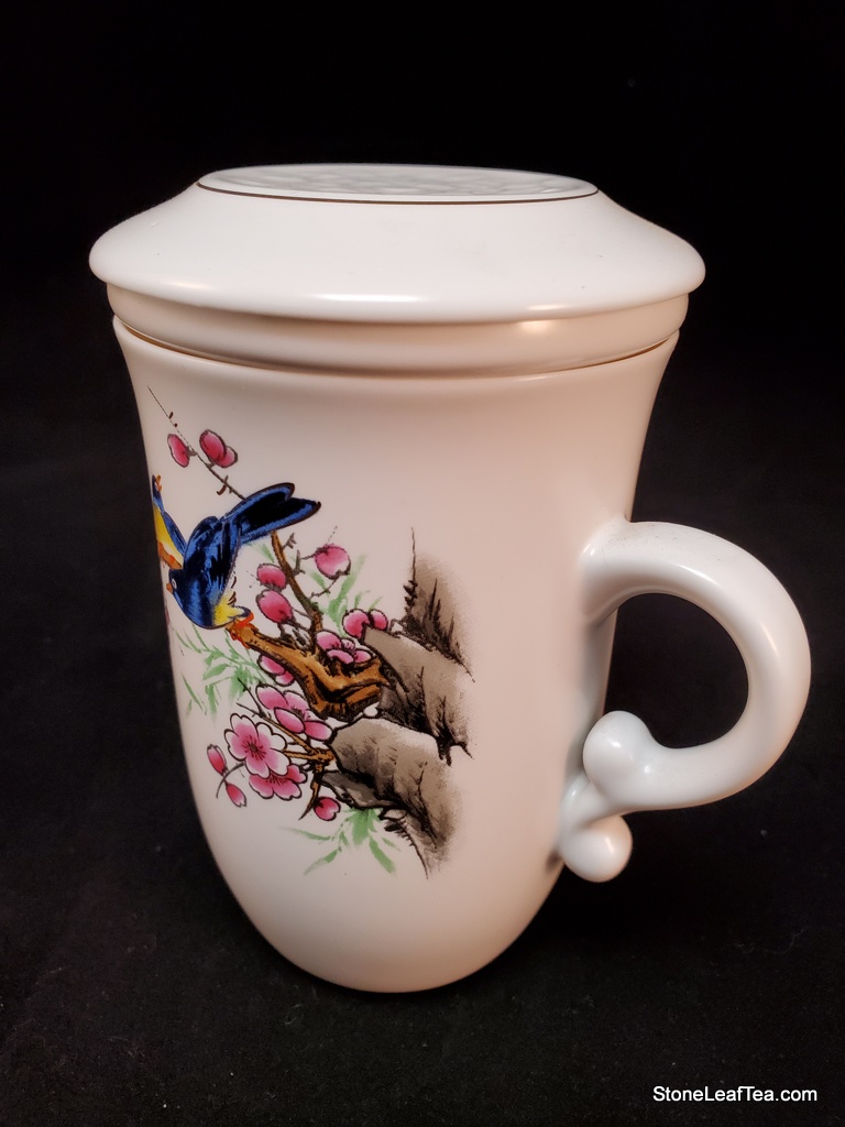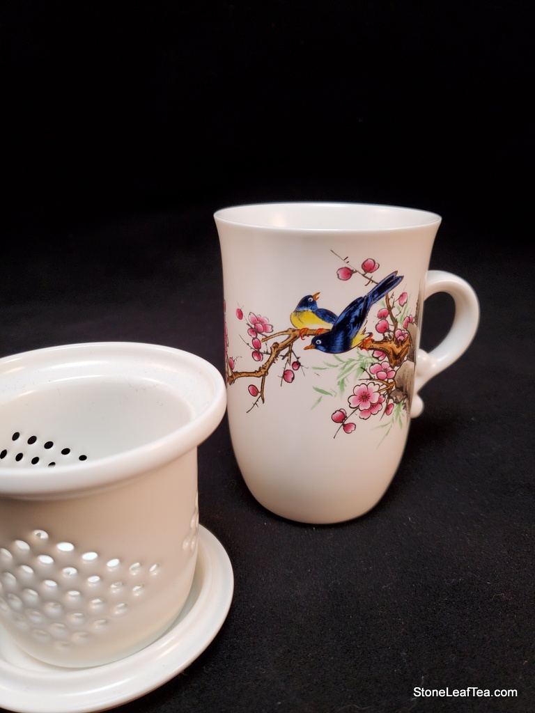 A beautifully painted, ceramic tea mug and infuser set.  Choose from three different elegant flower designs, with a beautifully crafted curled lip that is a pleasure to drink from.  The perfect size for a solo tea drinking session with any quality tea.  Put your favorite tea into the infuser, insert into the mug, fill with water, and let steep.  When your tea is ready, simply remover the infuser, place on the upside down lid, and enjoy.