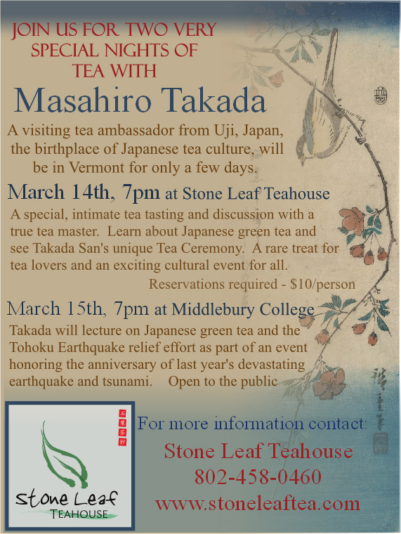 Special Japanese Tea Event!Posted on March 2, 2012September 24, 2013 by john Two very special events with our friend and teacher Masahiro Takada. Don’t miss this rare and exciting treat! Post navigationPrevious post: Fresh Loose Leaf Tea for Every SeasonNext post: Tea of the Month Club has Begun Leave a ReplyYour email address will not be published. Required fields are marked *Comment * Name * Email * Website Δ
