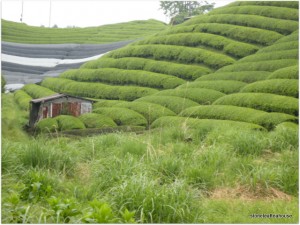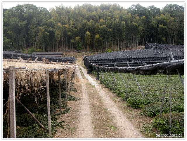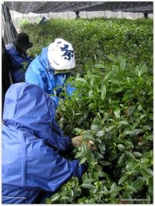 There are two kinds of shading methods used today. The traditional rice straw method, and the modern black plastic technique. Any differences? On a rainy day like today, the rain drops through the covering, imparting a touch of it’s flavor. Rice straw enriches the flavor, giving a subtle richness not present in the modern technique. Our Organic Gyokuro is covered with traditional rice straw.